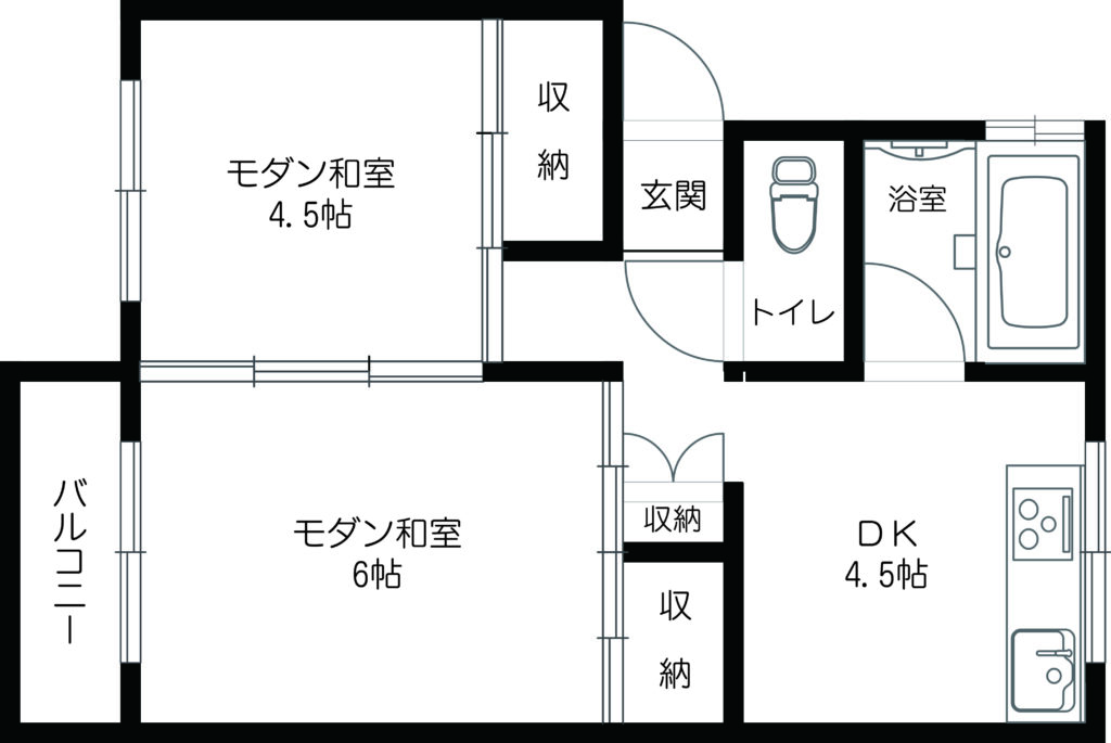 キッチン、バス、トイレ、風呂完備。